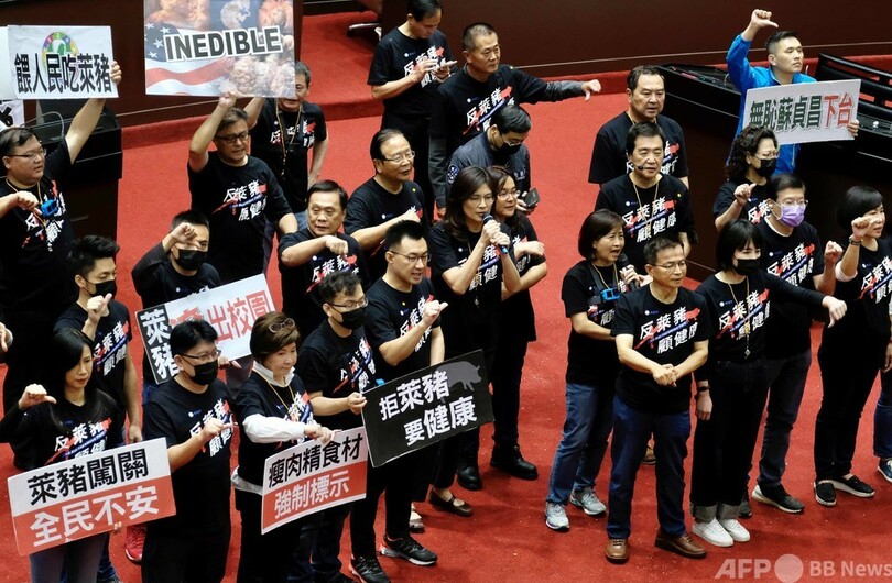 【11月27日 AFP】台湾の立法院(議会)で27日、政府が米国産豚肉の輸入規制緩和を決定したことを受け、野党議員らが議場で豚の内臓などを投げ付けて抗議した。