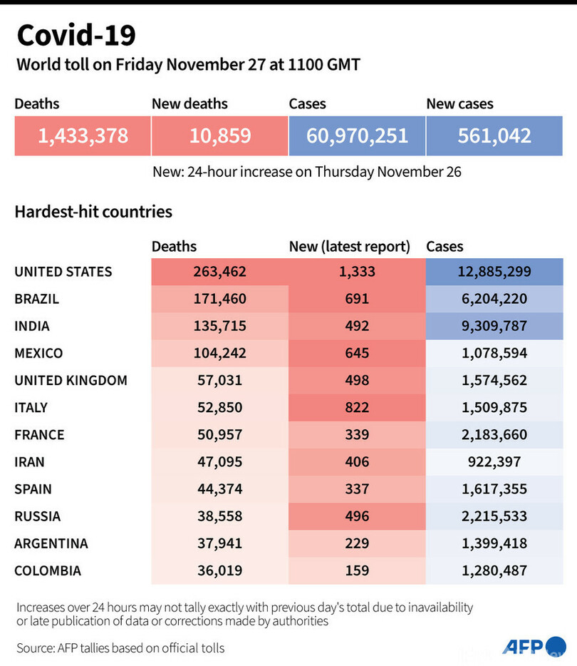 【11月27日 AFP】AFPが各国当局の発表に基づき日本時間27日午後8時にまとめた統計によると、世界の新型コロナウイルスによる死者数は143万3378人に増加した。