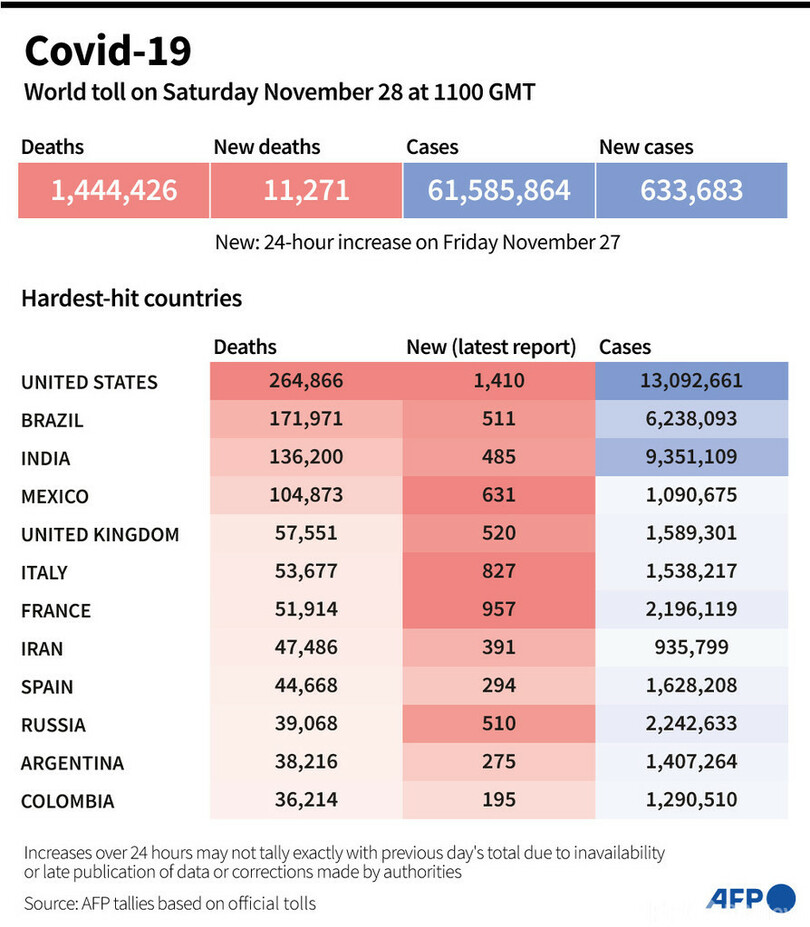 【11月28日 AFP】AFPが各国当局の発表に基づき日本時間28日午後8時にまとめた統計によると、世界の新型コロナウイルスによる死者数は144万4426人に増加した。