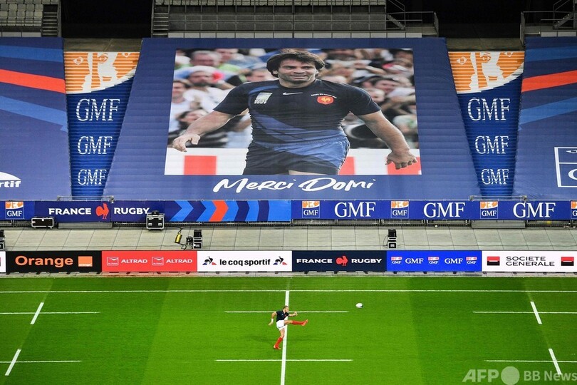 試合前には週の初めに亡くなったフランス代表のレジェンド、クリストフ・ドミニシ(Christophe Dominici)氏に黙とうがささげられ、無観客となったスタッド・ド・フランス(Stade de France)の客席には同氏の大きな写真が掲げられた。(c)AFP
