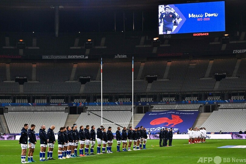 試合前には週の初めに亡くなったフランス代表のレジェンド、クリストフ・ドミニシ(Christophe Dominici)氏に黙とうがささげられ、無観客となったスタッド・ド・フランス(Stade de France)の客席には同氏の大きな写真が掲げられた。(c)AFP