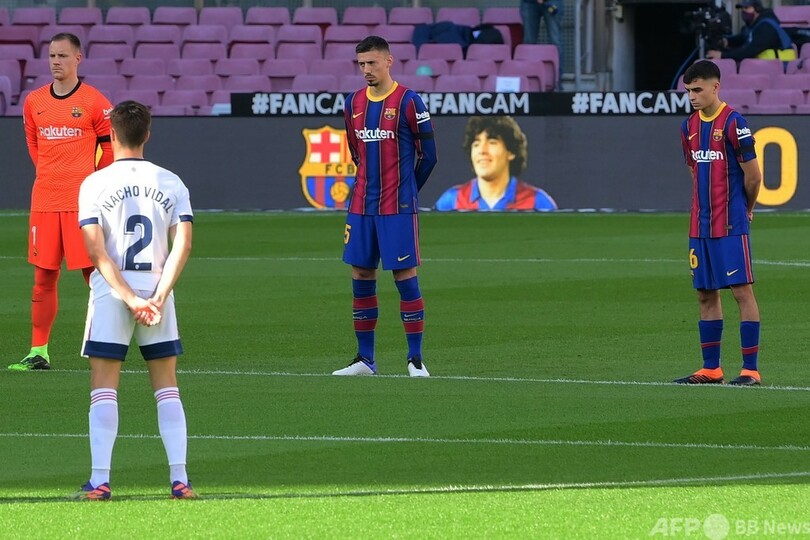 半旗が掲げられたバルセロナの本拠地カンプ・ノウ(Camp Nou)では、全てのスクリーンと広告板にマラドーナ氏の写真が映され、クラブの職員が、額縁に入ったバルセロナ時代の同氏のユニホームを抱えていた。