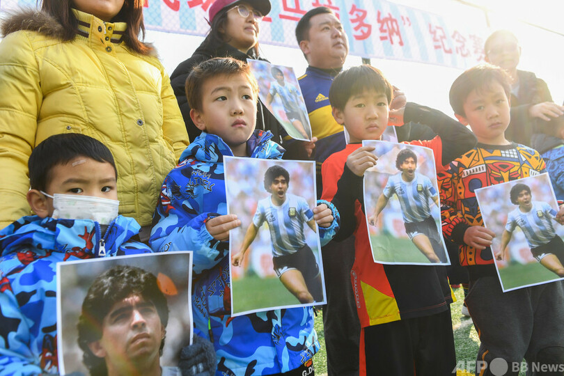 中国人にとって、サッカーはバスケットボールと並ぶ人気スポーツだ。海外トップクラスの試合がテレビの地上波で放映され、スポーツショップにはスター選手のレプリカユニホームが並んでいる。エネルギッシュで自由奔放な南米サッカーは昔から根強い人気があり、長い髪をたなびかせピッチを疾走するマラドーナ氏はその象徴的存在だった。スーパースターの訃報が伝わった際、中国版ツイッター「微博(ウェイボー、Weibo)」では「マラドーナ死去」が検索ワードランキング1位となり、「神のような存在だった」「伝説の5人抜きは忘れない」などの追悼のメッセージが次々と書き込まれていた。(c)CNS/JCM/AFPBB News
