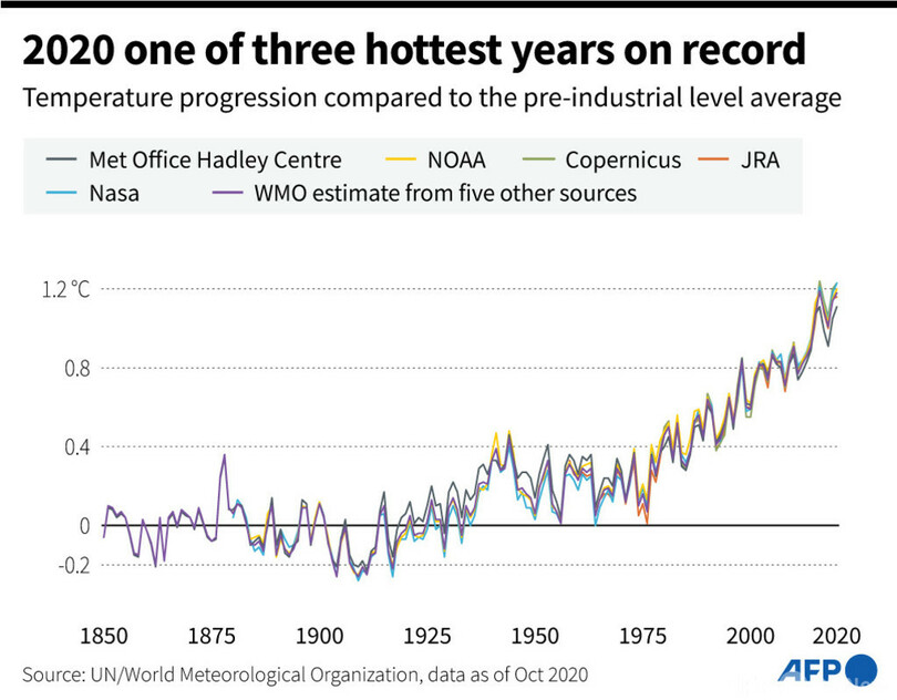 【12月2日 AFP】国連(UN)は2日、2020年は観測史上最も暑い年の3位以内に入る見通しで、過去最も暑かった2016年の記録を更新する可能性もあると発表した。