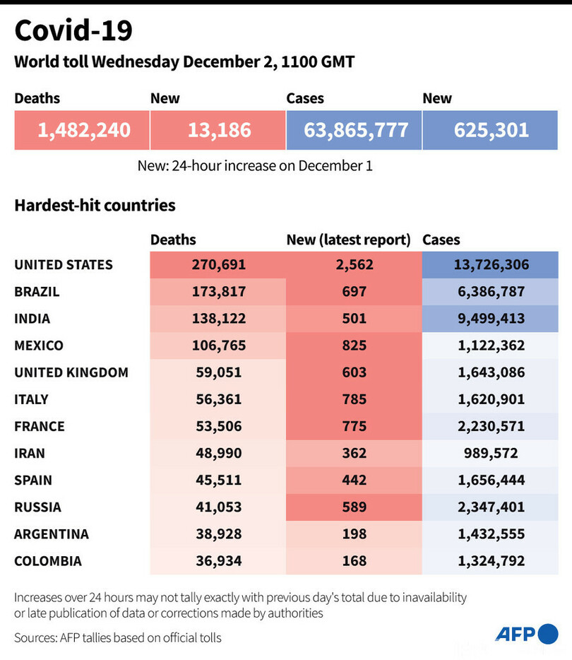 【12月3日 AFP】AFPが各国当局の発表に基づき日本時間2日午後8時にまとめた統計によると、世界の新型コロナウイルスによる死者数は148万2240人に増加した。