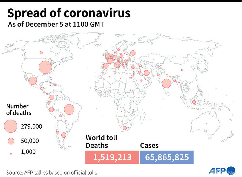 【12月6日 AFP】AFPが各国当局の発表に基づき日本時間5日午後8時にまとめた統計によると、世界の新型コロナウイルスによる死者数は151万9213人に増加した。