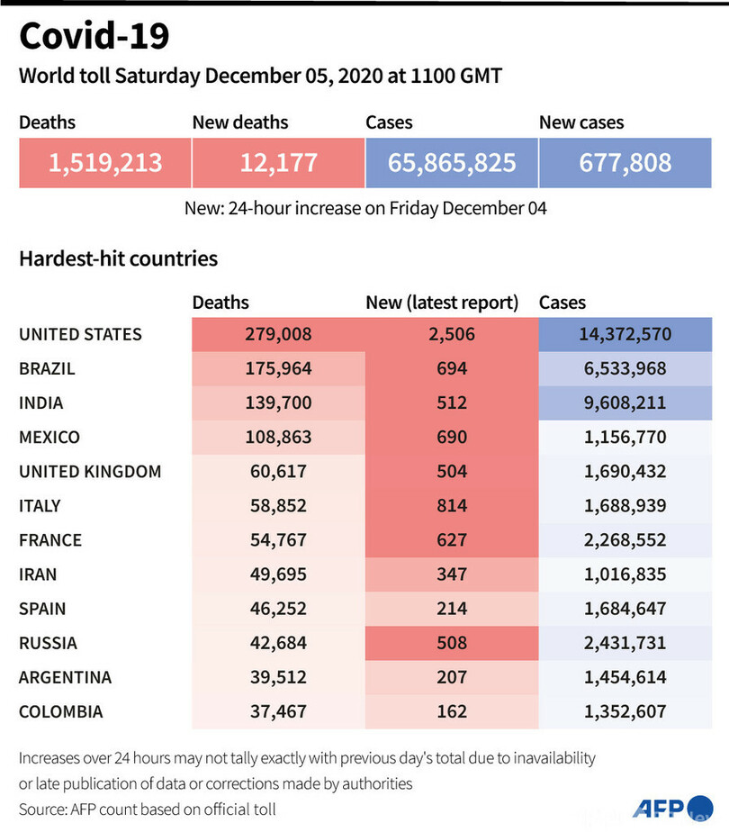 【12月6日 AFP】AFPが各国当局の発表に基づき日本時間5日午後8時にまとめた統計によると、世界の新型コロナウイルスによる死者数は151万9213人に増加した。