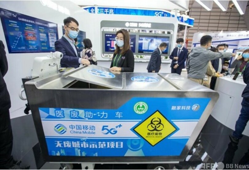 大手通信企業の中国移動(China Mobile)は医療廃棄物を回収する「5G医療廃棄物サポート車」などを展示し、浙江省紹興市(Shaoxing)での「廃棄物ゼロシティー」の取り組みを紹介。市内の産業廃棄物、建築廃棄物、家庭ごみなどの情報を共通のプラットフォームで一括管理しており、スタッフの沈源(Shen Yuan)さんは「プラットフォームの運営により、すべてのごみをリサイクルの対象にすることができています」と説明する。