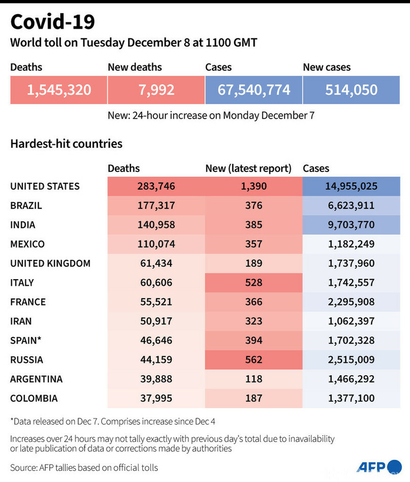 【12月9日 AFP】AFPが各国当局の発表に基づき日本時間8日午後8時にまとめた統計によると、世界の新型コロナウイルスによる死者数は154万5320人に増加した。