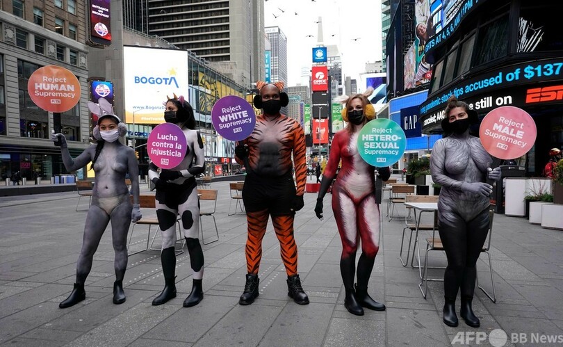 【12月9日 AFP】米ニューヨークのタイムズスクエア(Times Square)で8日、トラや牛などの模様のボディーペイントを施した「動物の倫理的扱いを求める人々の会(PETA)」のメンバーらが抗議デモを行った。