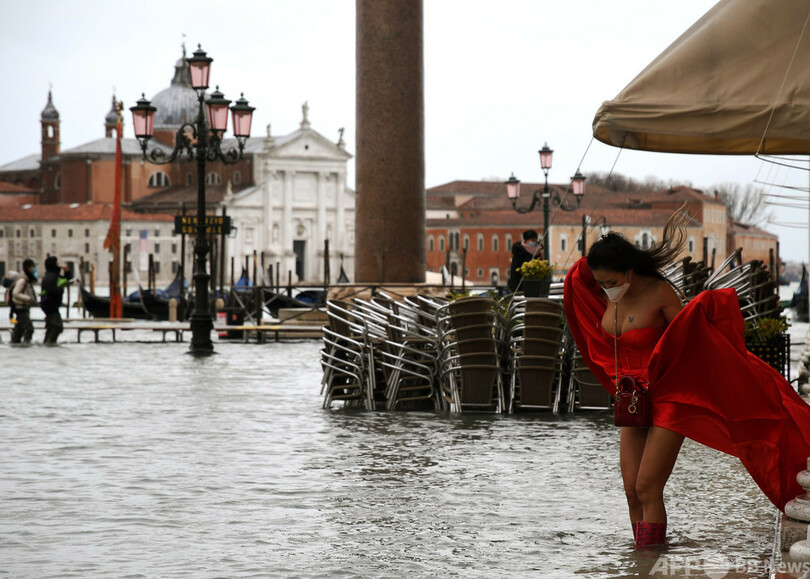 【12月14日 AFP】浸水したサンマルコ広場(St. Mark's Square)でドレスの裾を持つモデル。イタリア・ベネチア(Venice)で。
