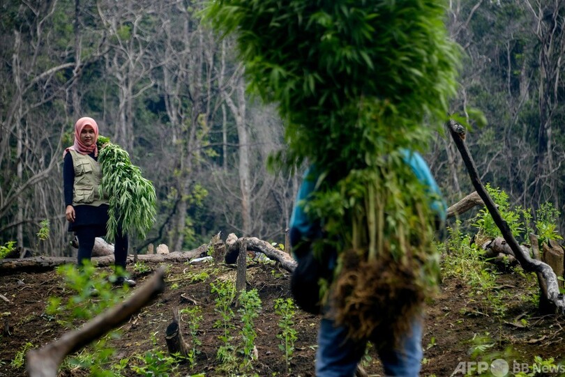 ニュース 社会 大麻農園4.5ヘクタールを破壊 インドネシア麻薬委員会 2020年12月10日 16:30 発信地:ラムテウバ/インドネシア [ インドネシア アジア・オセアニア ] このニュースをシェア ‹ › ❮ 14/16 ❯ インドネシア・アチェ州ラムテウバの大麻農園で刈り取られた大麻草を運ぶ人々(2020年12月9日撮影)。(c)CHAIDEER MAHYUDDIN / AFP 画像作成中 ! 【12月10日 AFP】インドネシア・アチェ(Aceh)州ラムテウバ(Lamteuba)の森林で9日、国家麻薬委員会(BNN)による強制捜索が行われ、警察と兵士が約4.5ヘクタールに及ぶ農園で大麻草を刈り取り、焼却した。(c)AFP 社会 一覧へ> メディア・報道関係・法人の方向け 写真・動画 購入のお問合せ>