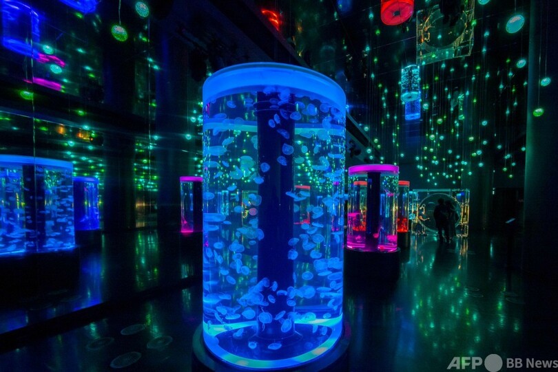 また、港区のマクセル アクアパーク品川(MAXELL AQUAPARK SHINAGAWA)では、イルミネーションで照らされた水槽で泳ぐ幻想的なクラゲの姿を見ることができる。(c)AFP
