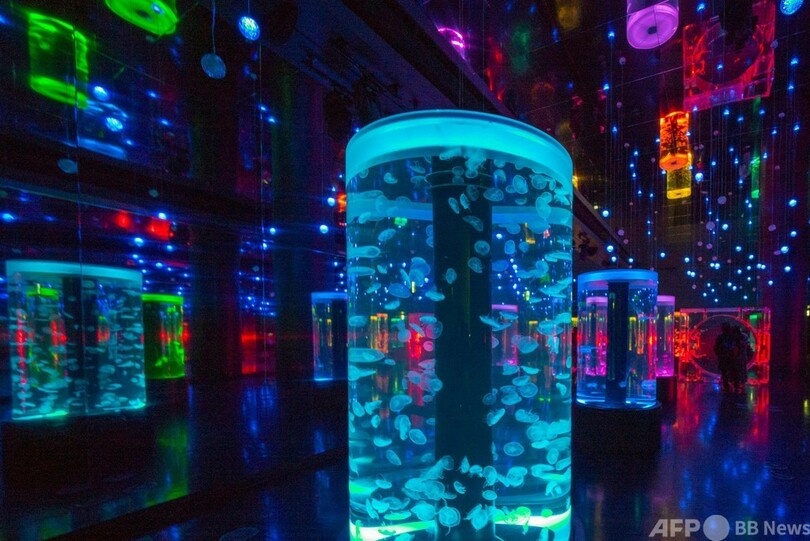 また、港区のマクセル アクアパーク品川(MAXELL AQUAPARK SHINAGAWA)では、イルミネーションで照らされた水槽で泳ぐ幻想的なクラゲの姿を見ることができる。(c)AFP