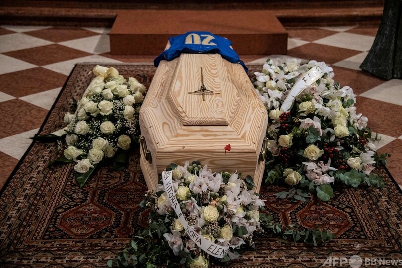 また、ひつぎの上にはヴィチェンツァのマフラーと並ぶ形で、イタリア代表の20番のユニホームが置かれた。(c)AFP