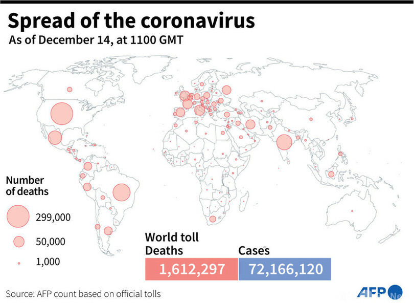 【12月15日 AFP】AFPが各国当局の発表に基づき日本時間14日午後8時にまとめた統計によると、世界の新型コロナウイルスによる死者数は161万2297人に増加した。