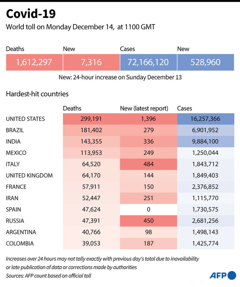 【12月15日 AFP】AFPが各国当局の発表に基づき日本時間14日午後8時にまとめた統計によると、世界の新型コロナウイルスによる死者数は161万2297人に増加した。