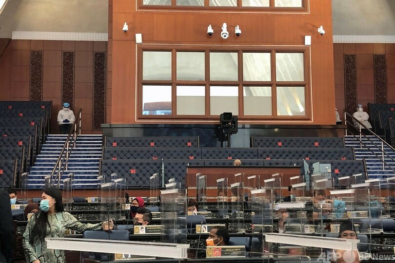 国営ベルナマ(Bernama)通信によると、議長は、防護服姿の閣僚らは救急車で移動し、別室に隔離されるなど対策を講じていたと主張、投票は実施された。野党議員らが多数退席したため、議題は簡単に可決された。(c)AFP