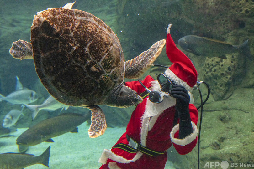 【12月16日 AFP】ギリシャ南部クレタ(Crete)島イラクリオン(Heraklion)にあるクレタ水族館(Creta Aquarium)にこのほど、サンタクロースの衣装を着たダイバーが登場した。水槽の中の「サンタダイバー」は、ウミガメと遊んだり、水槽の外に向けて手を振ったりして来場客を楽しませている。(c)AFP
