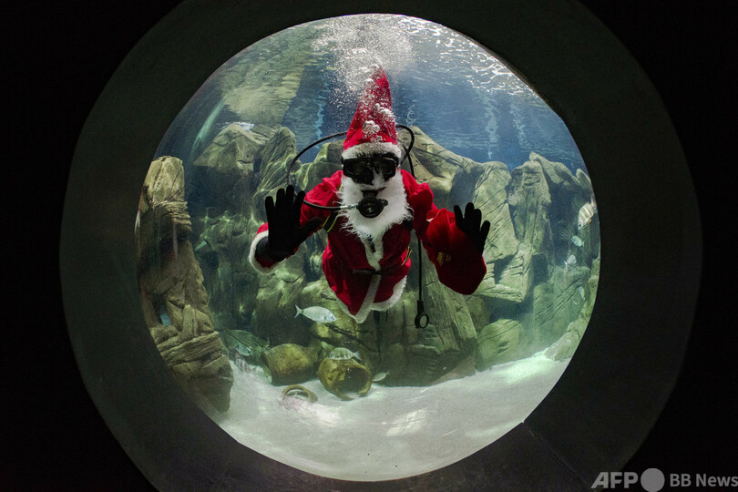 【12月16日 AFP】ギリシャ南部クレタ(Crete)島イラクリオン(Heraklion)にあるクレタ水族館(Creta Aquarium)にこのほど、サンタクロースの衣装を着たダイバーが登場した。水槽の中の「サンタダイバー」は、ウミガメと遊んだり、水槽の外に向けて手を振ったりして来場客を楽しませている。(c)AFP