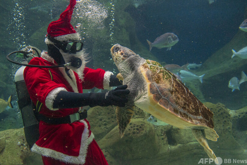 【12月16日 AFP】ギリシャ南部クレタ(Crete)島イラクリオン(Heraklion)にあるクレタ水族館(Creta Aquarium)にこのほど、サンタクロースの衣装を着たダイバーが登場した。水槽の中の「サンタダイバー」は、ウミガメと遊んだり、水槽の外に向けて手を振ったりして来場客を楽しませている。(c)AFP