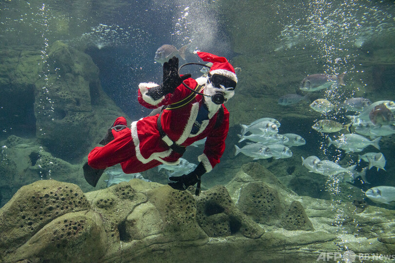 【12月16日 AFP】ギリシャ南部クレタ(Crete)島イラクリオン(Heraklion)にあるクレタ水族館(Creta Aquarium)にこのほど、サンタクロースの衣装を着たダイバーが登場した。水槽の中の「サンタダイバー」は、ウミガメと遊んだり、水槽の外に向けて手を振ったりして来場客を楽しませている。(c)AFP