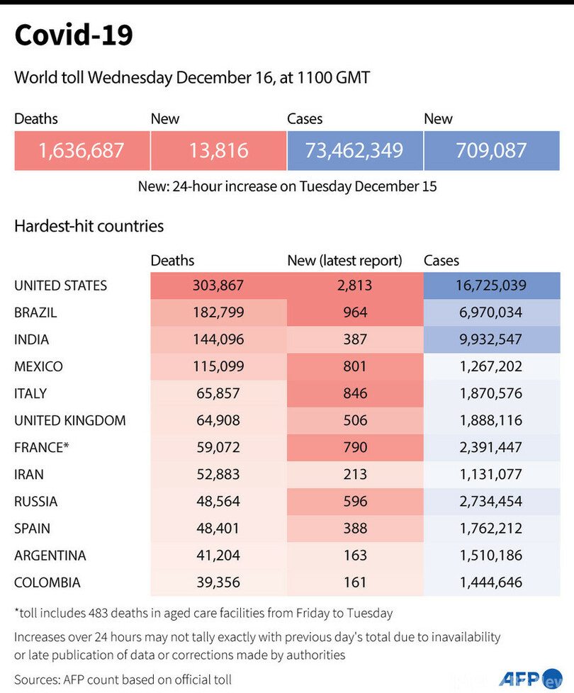 【12月17日 AFP】AFPが各国当局の発表に基づき日本時間16日午後8時にまとめた統計によると、世界の新型コロナウイルスによる死者数は163万6687人に増加した。