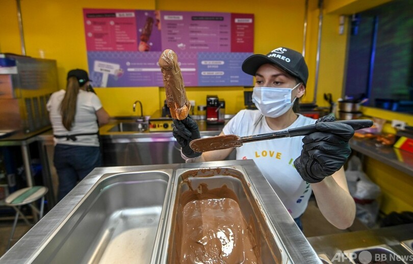 南米コロンビアの首都ボゴタにある性をテーマにしたフードショップで、男性器の形をしたワッフルにチョコレートをかける店員(2020年12月19日撮影)。(c)Juan BARRETO / AFP
