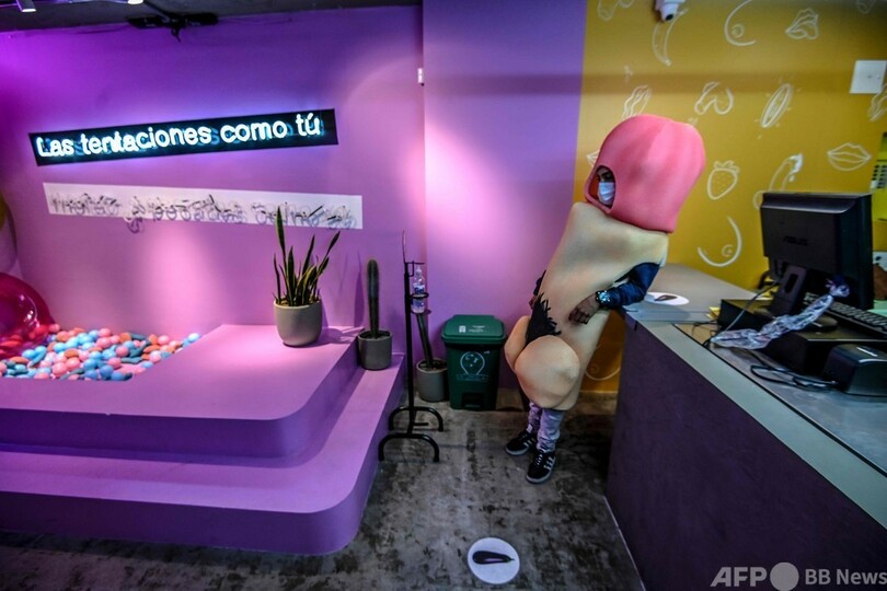 南米コロンビアの首都ボゴタにある性をテーマにしたフードショップで、男性器の形をしたコスチュームに身を包み、カウンターに寄りかかる男性(2020年12月19日撮影)。(c)Juan BARRETO / AFP