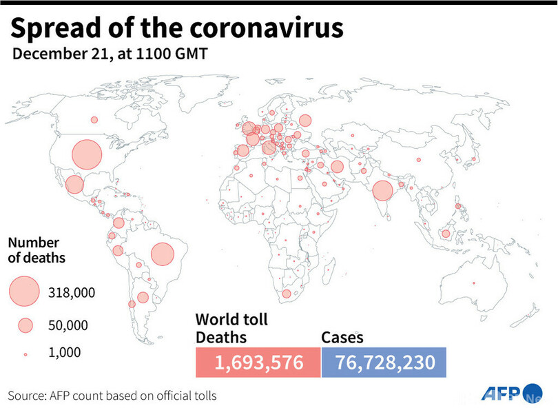 【12月22日 AFP】AFPが各国当局の発表に基づき日本時間21日午後8時にまとめた統計によると、世界の新型コロナウイルスによる死者数は169万3576人に増加した。