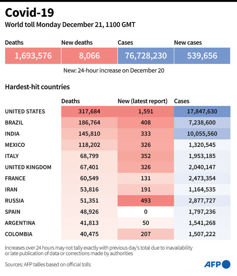 【12月22日 AFP】AFPが各国当局の発表に基づき日本時間21日午後8時にまとめた統計によると、世界の新型コロナウイルスによる死者数は169万3576人に増加した。