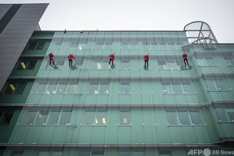 【12月22日 AFP】スロベニアの首都リュブリャナにある小児病院を、サンタクロースに扮(ふん)した男性たちが訪問した。サンタクロースたちは病院の屋根からロープを使って壁を下り、院内の子どもたちと交流した。(c)AFP