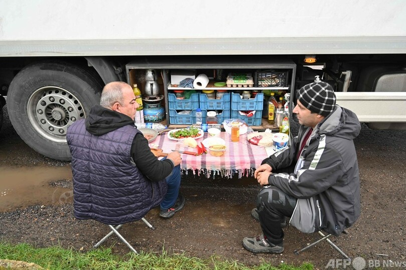 ニュース ライフ パーキングエリアで朝食を…英に足止めのトルコ人トラック運転手 2020年12月23日 19:35 発信地:アシュフォード/英国 [ 英国 ヨーロッパ ] このニュースをシェア ‹ › ❮ 1/7 ❯ 英南東部のドーバー港へと続く高速道路M20沿いのパーキングエリアで、朝食を取るトルコ人トラック運転手ら(2020年12月18日撮影)。(c)Ben STANSALL / AFP 画像作成中 ! 【12月23日 AFP】英イングランド南東部ケント(Kent)のアシュフォード(Ashford)近郊で22日、トラックの脇でトルコ人の運転手らが朝食を作り食べていた。 トラックは、ドーバー(Dover)港へ続く高速道路M20沿いのパーキングエリアに止められたもの。英国での新型コロナウイルス変異種の感染拡大を受け、フランスが英国からの入国を禁止したため、多くのトラックが港付近に足止めされた。(c)AFP ライフ 一覧へ> メディア・報道関係・法人の方向け 写真・動画 購入のお問合せ>