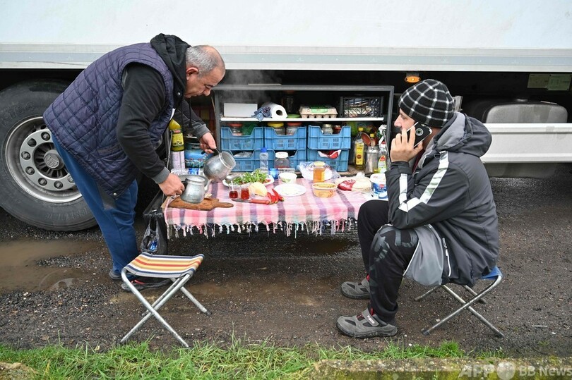 ニュース ライフ パーキングエリアで朝食を…英に足止めのトルコ人トラック運転手 2020年12月23日 19:35 発信地:アシュフォード/英国 [ 英国 ヨーロッパ ] このニュースをシェア ‹ › ❮ 6/7 ❯ 英南東部のドーバー港へと続く高速道路M20沿いのパーキングエリアで、朝食を取るトルコ人トラック運転手ら(2020年12月18日撮影)。(c)Ben STANSALL / AFP 画像作成中 ! 【12月23日 AFP】英イングランド南東部ケント(Kent)のアシュフォード(Ashford)近郊で22日、トラックの脇でトルコ人の運転手らが朝食を作り食べていた。 トラックは、ドーバー(Dover)港へ続く高速道路M20沿いのパーキングエリアに止められたもの。英国での新型コロナウイルス変異種の感染拡大を受け、フランスが英国からの入国を禁止したため、多くのトラックが港付近に足止めされた。(c)AFP ライフ 一覧へ> メディア・報道関係・法人の方向け 写真・動画 購入のお問合せ>