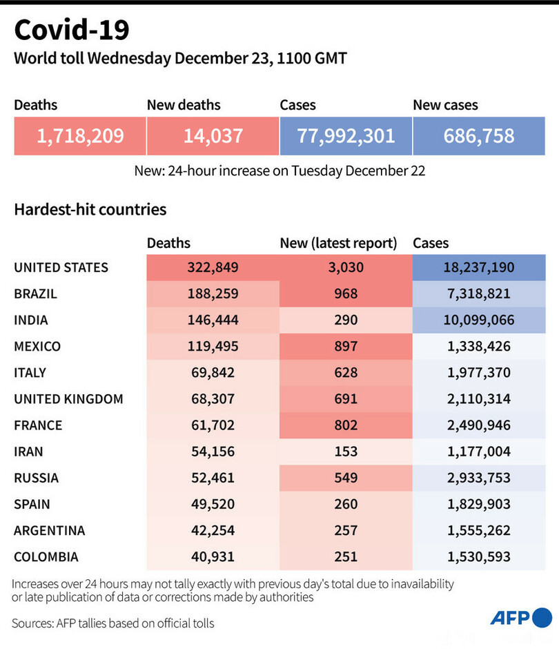 【12月24日 AFP】AFPが各国当局の発表に基づき日本時間23日午後8時にまとめた統計によると、世界の新型コロナウイルスによる死者数は171万8209人に増加した。
