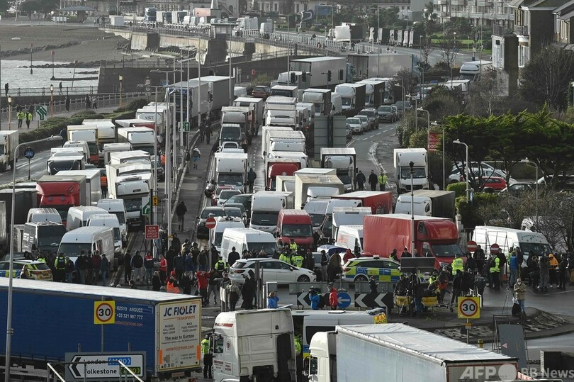 英国は先週、イングランド南部で変異種の感染が拡大していると発表。これを受け、フランスを含む50か国以上が英国との間の渡航を制限した。英国と欧州大陸間の貨物輸送が停止されたことから、主要通関地のドーバー(Dover)周辺は混乱。サプライチェーンがまひし、英国内の食品不足につながる懸念が出ている。(c)AFP