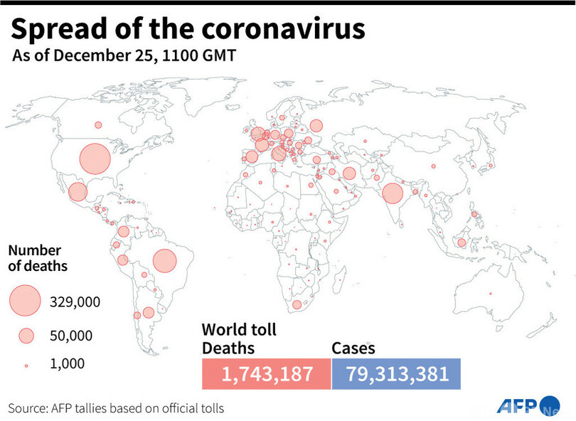 【12月25日 AFP】AFPが各国当局の発表に基づき日本時間25日午後8時にまとめた統計によると、世界の新型コロナウイルスによる死者数は174万3187人に増加した。