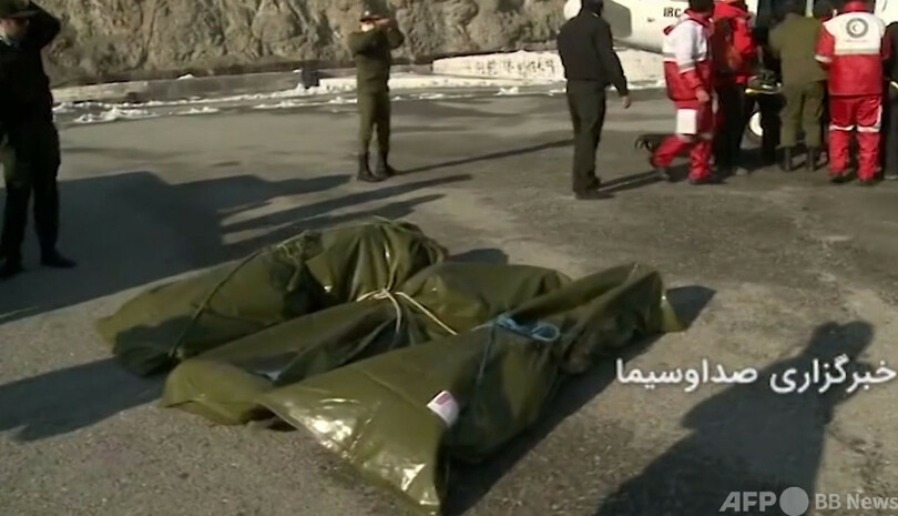 イラン国営テレビは、テヘラン郊外にそびえるアルボルズ(Alborz)山脈のトチャル(Tochal)山やコラクチャル(Kolakchal)山で行われたヘリコプターによる救助活動の一環で、赤新月社の要員が積雪のある山のふもとで遺体を担架で搬送している映像を伝えた。赤新月社の救助隊員は、「悪天候と積雪」の影響で捜索救助活動が難航していると語った。(c)AFP