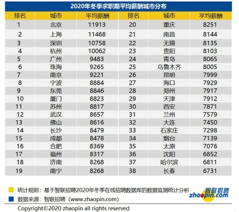そのうち、北京は月給11913元で引き続き1位となり、以下の順位は上海が11468元、深セン(Shenzhen)が10758元、杭州(Hangzhou)が10062元となり、いずれも1万元以上に達しています。それに続いて、5位~10位は広州(Guangzhou)、珠海(Zhuhai)、南京(Nanjing)、寧波(Ningbo)、東莞(Dongguan)、アモイ(Xiamen)の順です。トップ10の都市のうち、9市が南方の都市である一方、北方の長春(Changchun)、ハルビン(Harbin)、瀋陽(Shenyang)、太原(Taiyuan)、煙台(Yantai)などは月給が割合少ない傾向にあります。