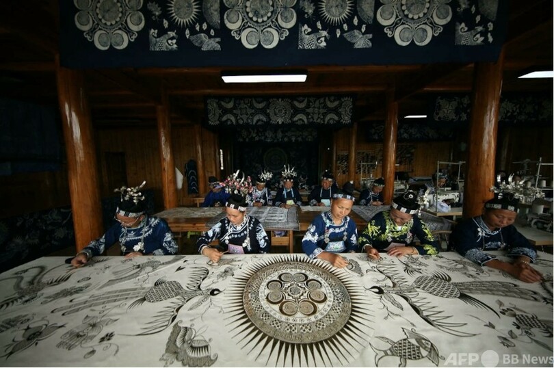 湖南省(Hunan)花垣県(Huayuan)でも、出稼ぎに出ていた女性たちが故郷に戻り、工房で刺しゅう作りにいそしんでいる。「家族と一緒に家で過ごしながら仕事ができるのは本当に幸せ」。女性たちは一様に喜びの声を上げている。(c)People’s Daily/AFPBB News