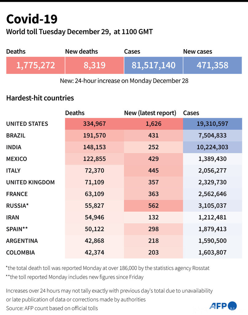 【12月30日 AFP】AFPが各国当局の発表に基づき日本時間29日午後8時にまとめた統計によると、世界の新型コロナウイルスによる死者数は177万5272人に増加した。
