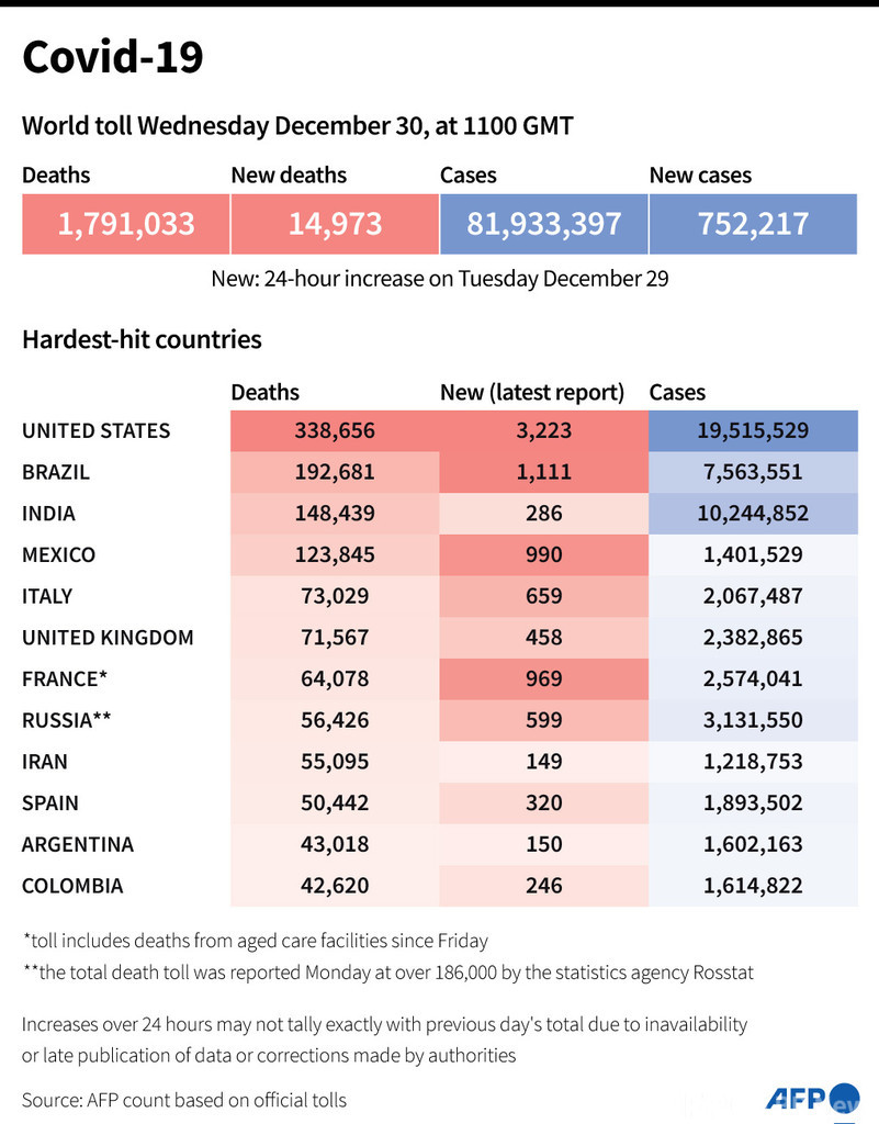 【12月31日 AFP】AFPが各国当局の発表に基づき日本時間30日午後8時にまとめた統計によると、世界の新型コロナウイルスによる死者数は179万1033人に増加した。