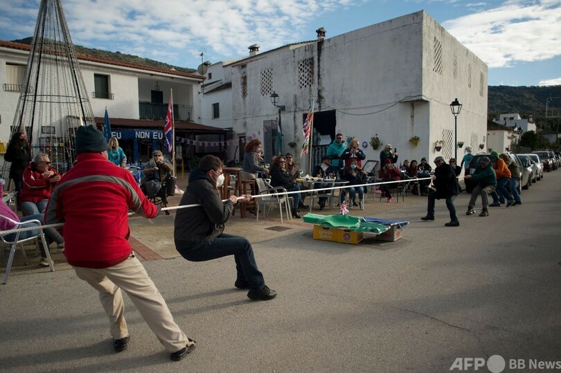 【1月3日 AFP】英国定番料理「バンガーズ・アンド・マッシュ」やビール、英国人対英国以外の欧州出身者による綱引き大会、BGMは「Don't Leave Me This Way(こんなふうに置き去りにしないで)」や「We'll Meet Again(また会いましょう)」━━。スペイン在住の英国人が、欧州連合(EU)に英国流に別れを告げるパーティーを開催した。