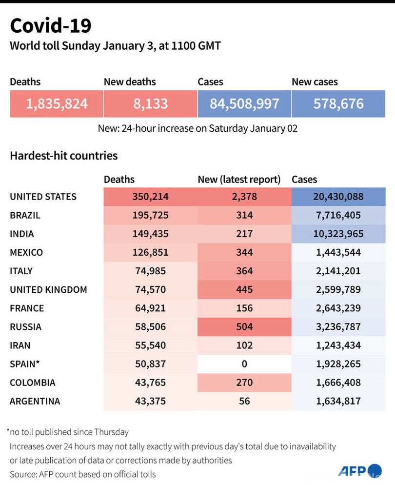 【1月4日 AFP】AFPが各国当局の発表に基づき日本時間3日午後8時にまとめた統計によると、世界の新型コロナウイルスによる死者数は183万5824人に増加した。