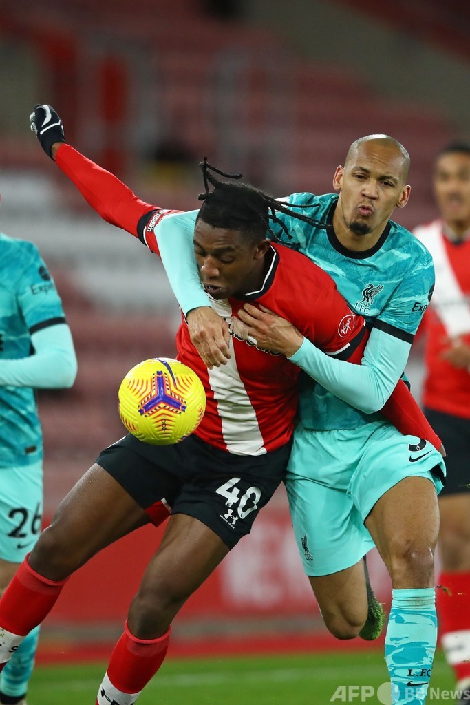 ジェームズ・ウォード・プラウズ(James Ward-Prowse)がペナルティーエリア内に送ったFKにトレント・アレクサンダー・アーノルド(Trent Alexander-Arnold)は対応することができず、イングスはGKアリソン(Alisson Ramses Becker)の頭上を越すシュートをファーサイドのネットに流し込んだ。(c)AFP