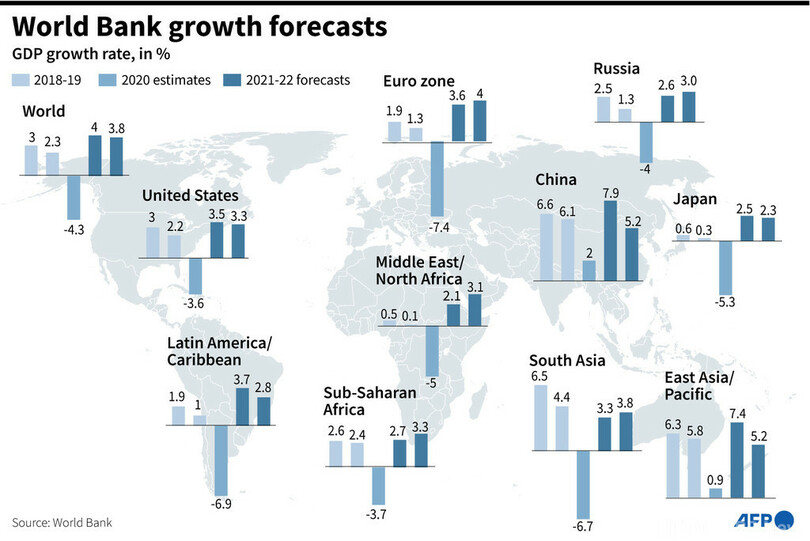 【1月6日 AFP】世界銀行(World Bank)は5日、半年に一度の世界経済見通しを発表し、2021年の世界全体の経済成長率を4.0%に引き下げるとともに、新型コロナウイルスの感染拡大ペースが加速したりワクチンの普及が遅れたりすれば事態は悪化する恐れがあると警告した。