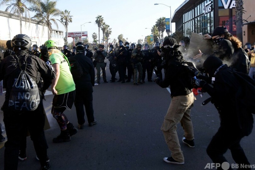【1月10日 AFP】米カリフォルニア州サンディエゴ(San Diego)のパシフィックビーチ(Pacific Beach)で9日、ドナルド・トランプ(Donald Trump)大統領の支持者らによるデモが行われ、それに対抗する抗議デモも行われた。