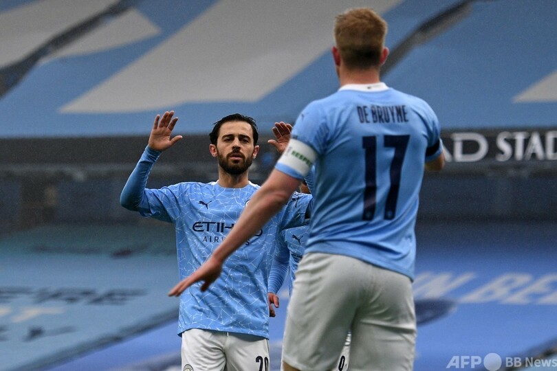 その一人のベルナルド・シウバは8分に見事なハーフボレーで先制点をマークすると、15分にはゴール前に詰めて2点目を記録。さらにシティは33分にはフィル・フォーデン(Phil Foden)がゴールネットを揺らした。(c)AFP/Steven GRIFFITHS