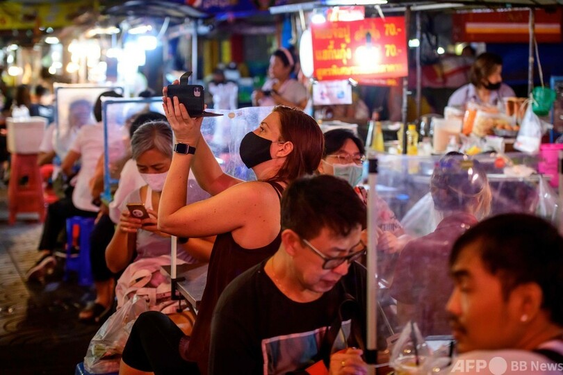 【1月13日 AFP】タイの首都バンコクのチャイナタウンで10日、パーティション越しに屋台で食事を楽しむ人々の姿がみられた。パーティションの設置は、当局による新型コロナウイルス感染症(COVID-19)対策の一環で飲食店に定められた規制を受けたもの。(c)AFP