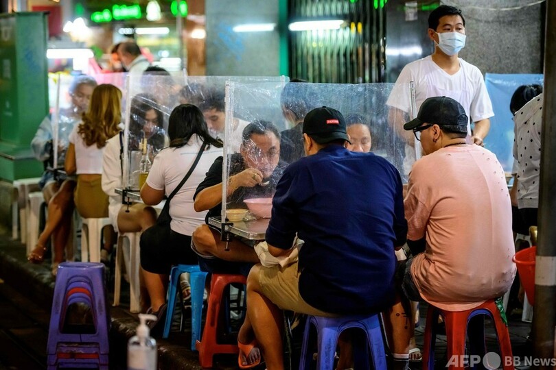 【1月13日 AFP】タイの首都バンコクのチャイナタウンで10日、パーティション越しに屋台で食事を楽しむ人々の姿がみられた。パーティションの設置は、当局による新型コロナウイルス感染症(COVID-19)対策の一環で飲食店に定められた規制を受けたもの。(c)AFP